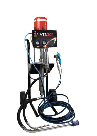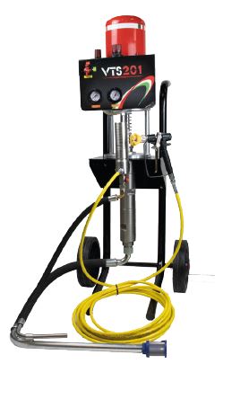 Pompa airless penumatica a pistone in acciaio inox montata su carrello completa di filtro riduttore e lubrificatore e filtro di linea.