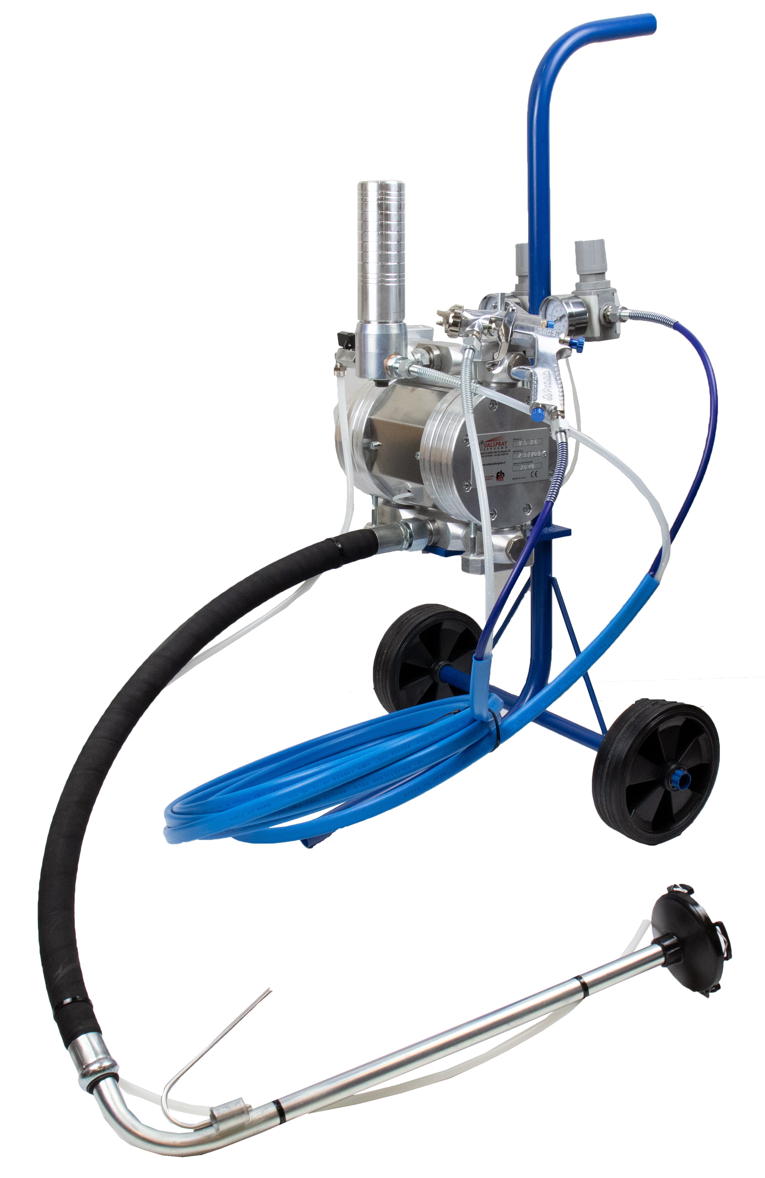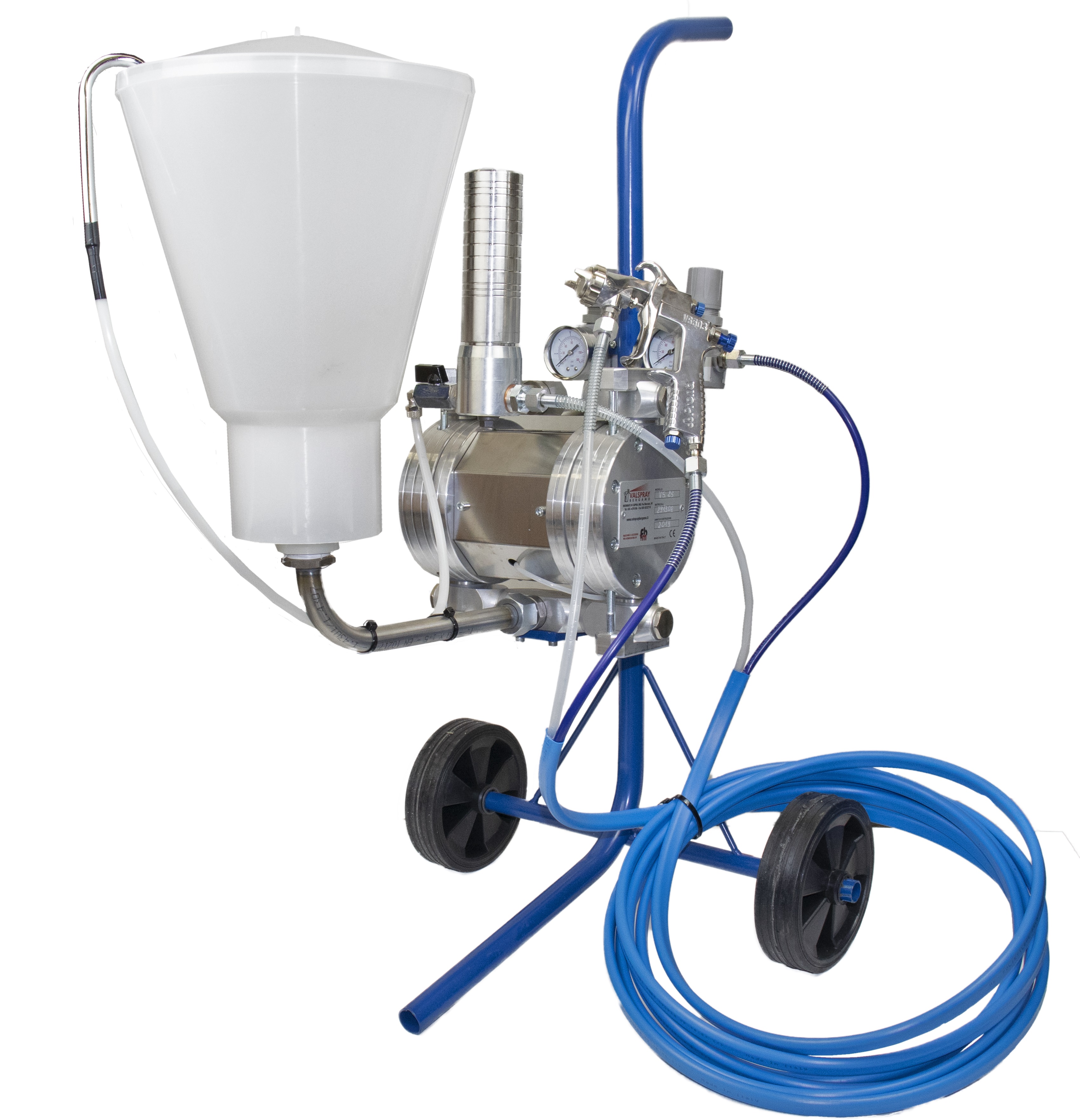 La pompa VS 25 è una pompa semplice e robusta, viene fornita montata su carrello completa di riduttori con manometro e filtro di linea, da completare solamente con pescante o serbatoio per l'alimentazione prodotto, tubo di mandata prodotto e pistola a spruzzo.