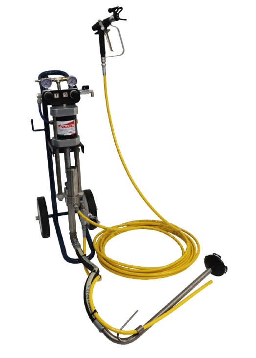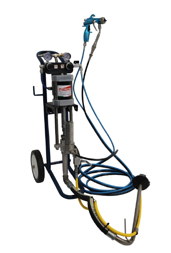 Pompa airless pneumatica a pistone in acciaio inox montata su carrello completa di filtro riduttore e filtro di linea.